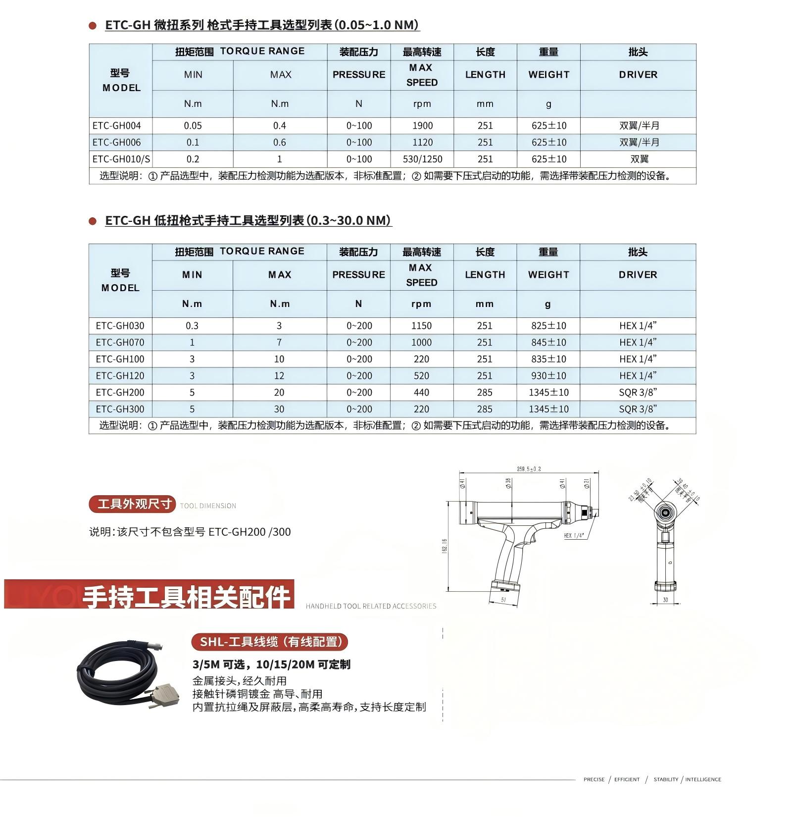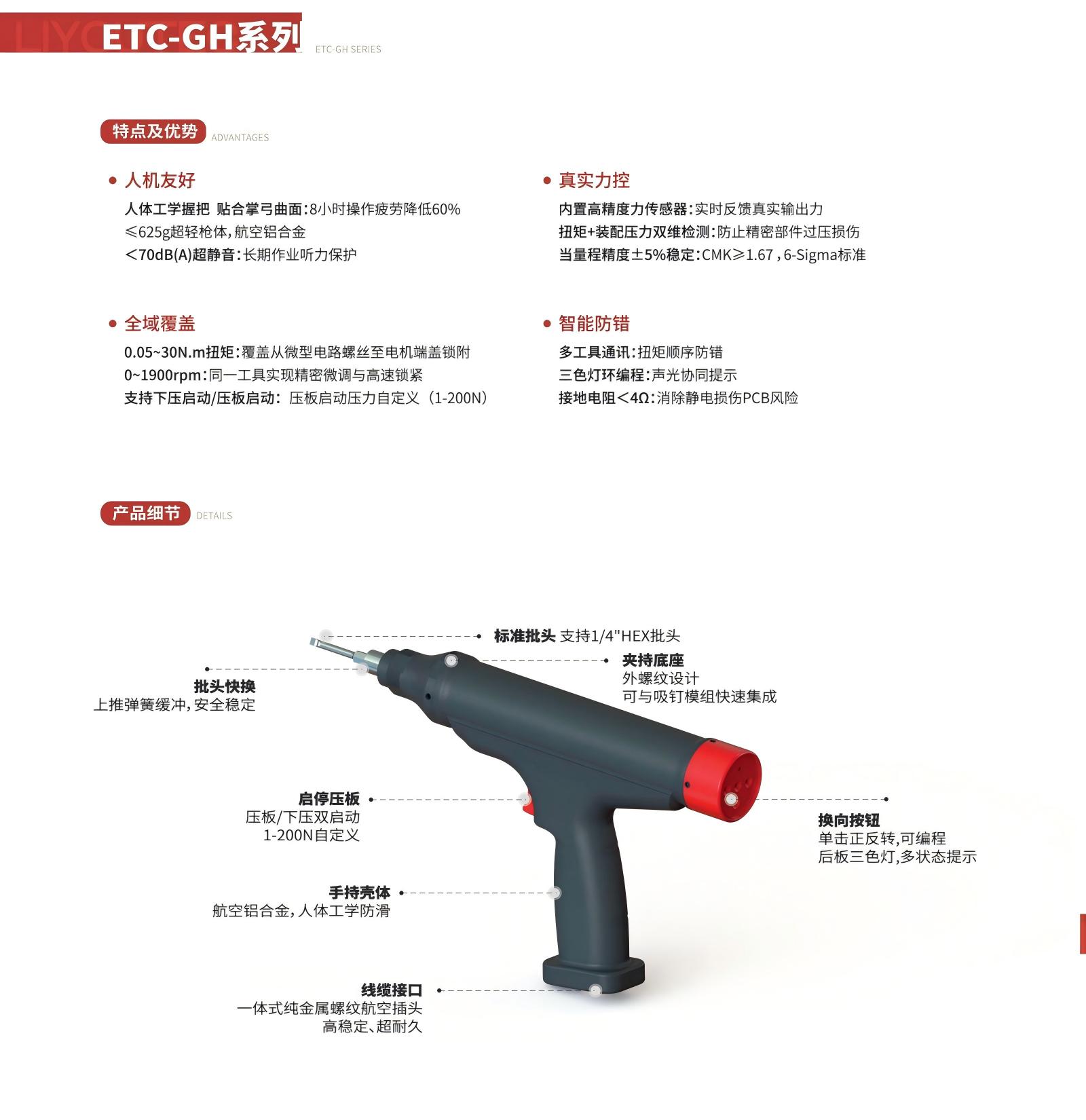 扭矩:0.05~30.0 N.m ~ 装配压力:0-200 N ~ 最高转速:1900 RPM ~ 精度:6-Sigma ±5% ~ 重量:820±5g ~力优直柄手持拧紧工具是一款性价比极高的可实现人工数字化、高精度作业的专业螺钉拧紧装配工具。优于市场通用拧紧技术,设备采用力优首创TPS检控技术,从影响最终夹紧力的两个关键力维度——实时扭矩及装配压力(Torque& Pressure)出发,采用超高分辨率的压力及扭矩复合力传感器对工具末端的输出扭矩及压力进行实时检测与采集,并与中心程序控制器交互,形成力的闭环控制处理,结合实时扭矩、转角、转速等多种控制方式,在实现6-sigma下目标扭矩±5%精度控制的同时,极大保证螺钉锁付质量的一致性。