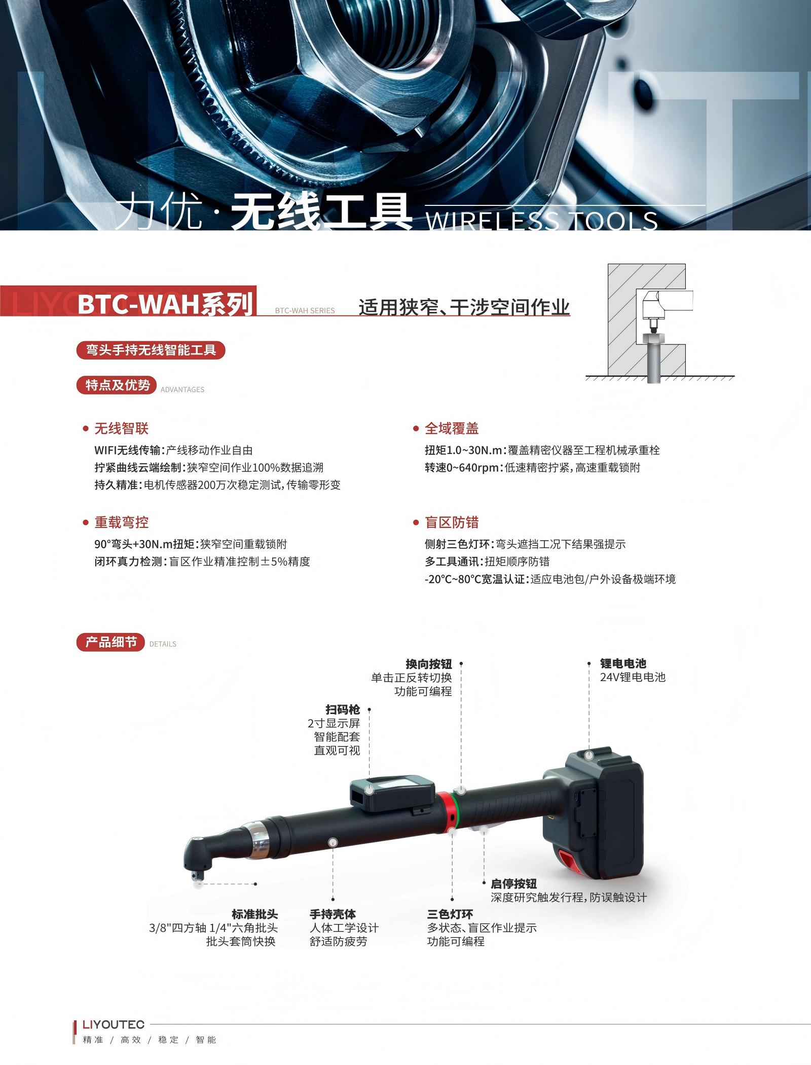 随着智能制造的发展及产业升级,螺钉拧紧这一最为普遍的作业场景成为实现数字化生产的基础场景。为了满足更多的锁付场景,力优专业团队设计的兼顾性能和控制力的完全国产化无线工具,满足有线工具无法完成的拧紧场景的同时,为客户提供更具性价比的智能工具。该产品中,拧紧工具头部呈90度弯曲造型,这使得它特别适合在狭窄、受限的空间内进行操作,该工具也改善了操作人员的人机工程学体验,减少不必要的别扭姿势,降低疲劳度,工具的无线WIFI传输功能更是摆脱了线缆的束缚,让作业更灵活方便,是现代化、自动化装配线上不可或缺的关键设备。