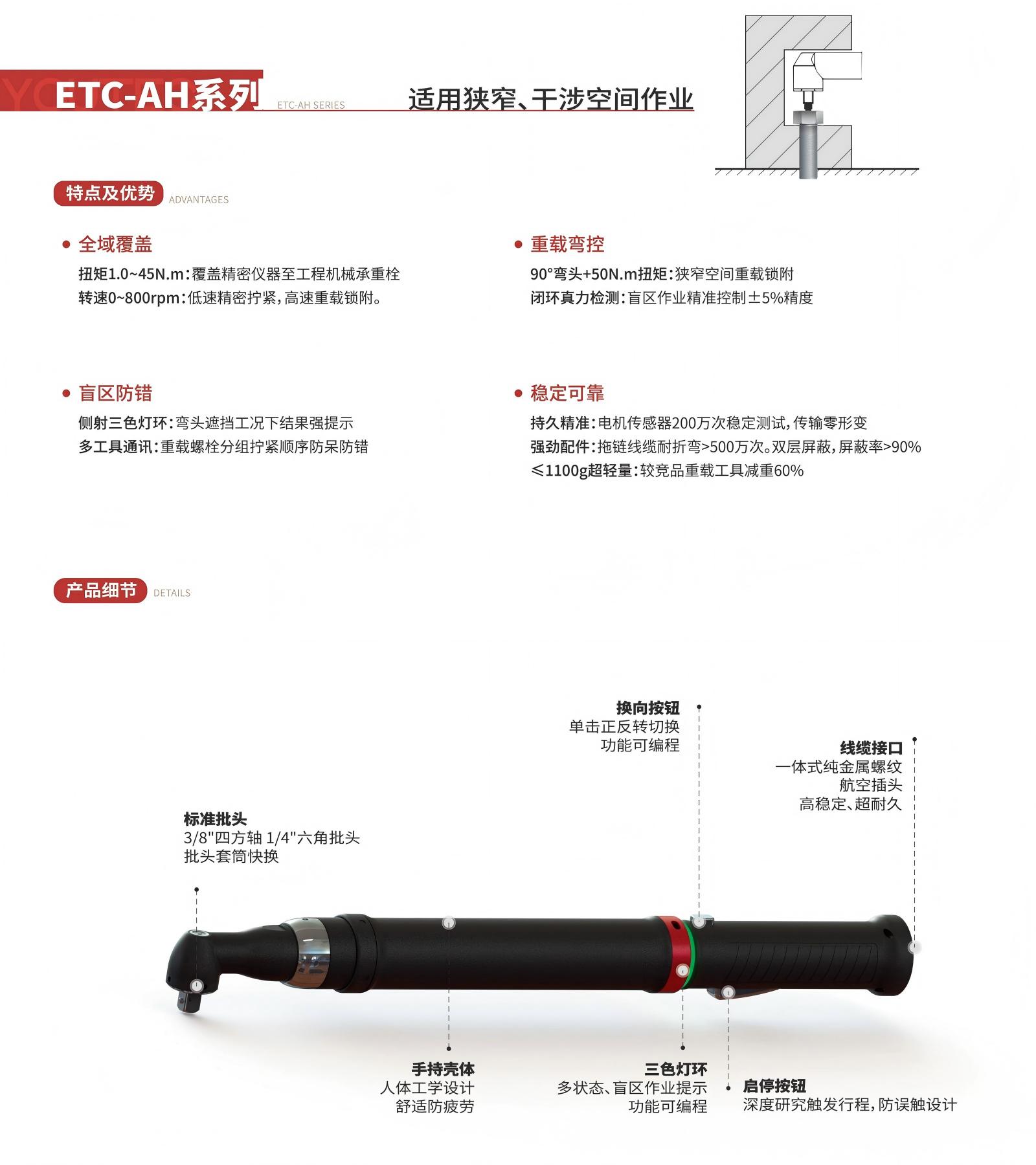 弯头传感式拧紧工具头部呈90度弯曲造型,这使得它特别适合在狭窄、受限的空间内进行操作,无论是发动机舱、设备内部还是密集的管线之间,直柄工具无法施展时,弯头工具都能轻松应对。内置的扭矩传感器,能够实时监测和反馈施加的扭矩值,此外,工具与控制器连接,可以实现精准的扭矩控制,确保每个螺栓的紧固力都均匀、一致且符合工艺要求,有效防止过拧紧或拧紧不足,保障产品质量和安全。作为智能工具,它能够记录并输出每一次拧紧的完整数据。实现生产过程的全程可追溯。该工具也改善了操作人员的人机工程学体验,减少不必要的别扭姿势,降低疲劳度,是现代化、自动化装配线上不可或缺的关键设备。
