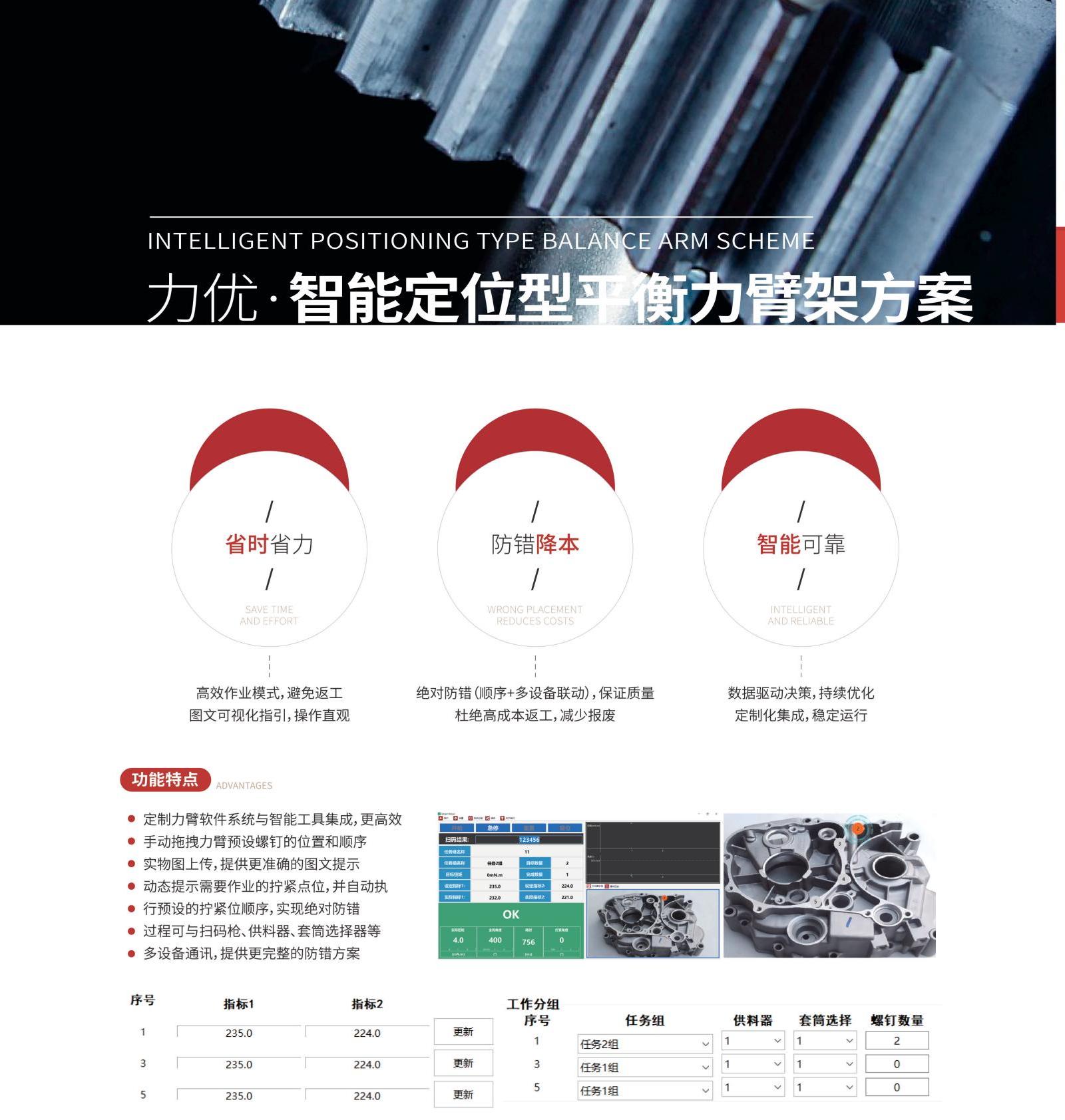 大力矩手持拧紧场景,使用平衡力臂架可明显降低拧紧的反作用力,极大减轻操作员作业强度的同时,保证了更高的拧紧质量。采用智能定位型力臂,可结合完善的软件布局,实现装配图文可视化,多设备交互,以及严谨的防错方案,为客户避免了繁琐且高成本的返工。此外,数据的采集与分析,可以帮助您做出更准确的工艺优化决策。