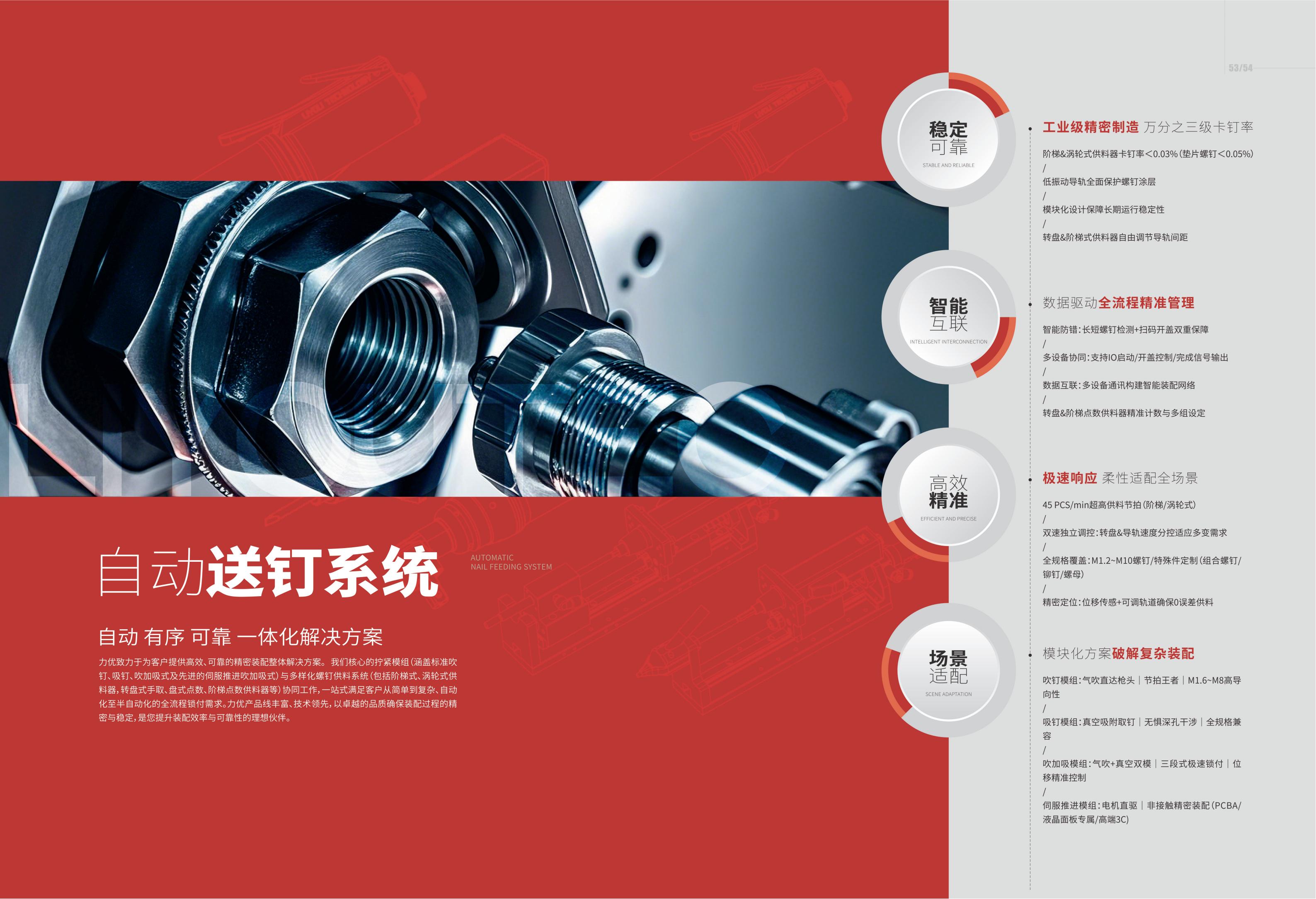 力优以传感器式智能拧紧工具作为核心系列产品的同时,可以为客户提供精密装配整提解决方案。力优拧紧模组及螺钉供料系统系列产品,可以帮助客户完成一站式自动化/半自动化锁付方案。更重要的是,我们致力于为客户提供更具性价比的整体解决方案,帮助客户更快实现商业成功。