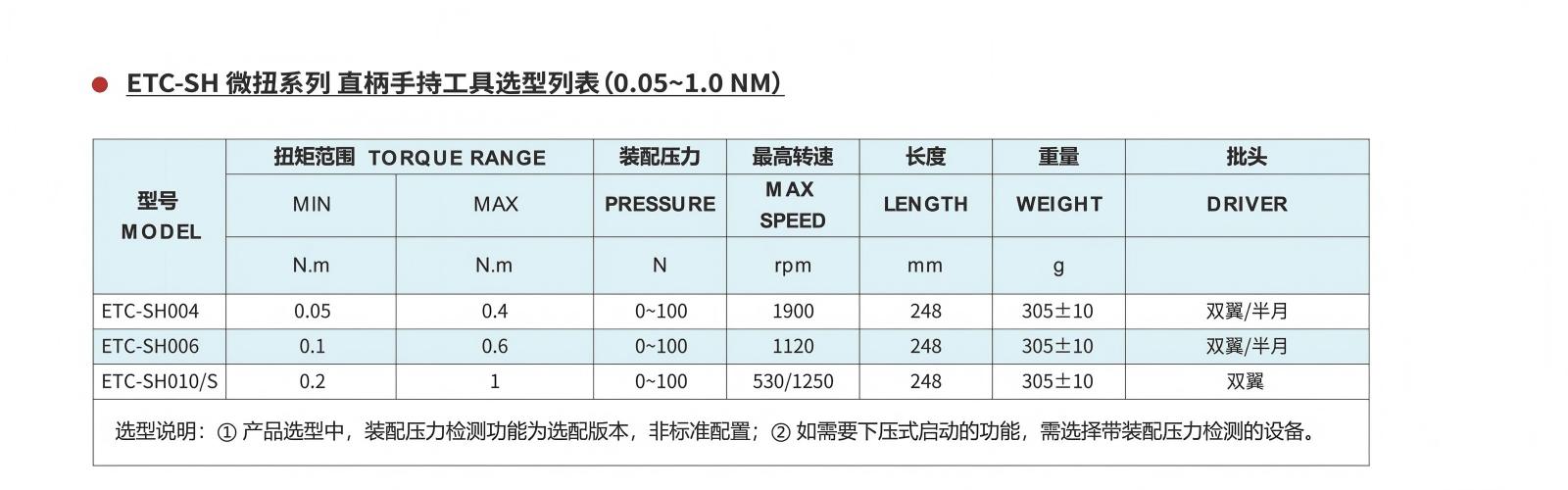 扭矩:0.05~1.0 N.m ~ 装配压力:0-100 N ~ 最高转速:1900 RPM ~ 精度:6-Sigma ±5% ~ 重量:305±10g ~力优直柄手持拧紧工具是一款性价比极高的可实现人工数字化、高精度作业的专业螺钉拧紧装配工具。优于市场通用拧紧技术,设备采用力优首创TPS检控技术,从影响最终夹紧力的两个关键力维度——实时扭矩及装配压力(Torque& Pressure)出发,采用超高分辨率的压力及扭矩复合力传感器对工具末端的输出扭矩及压力进行实时检测与采集,并与中心程序控制器交互,形成力的闭环控制处理,结合实时扭矩、转角、转速等多种控制方式,在实现6-sigma下目标扭矩±5%精度控制的同时,极大保证螺钉锁付质量的一致性。